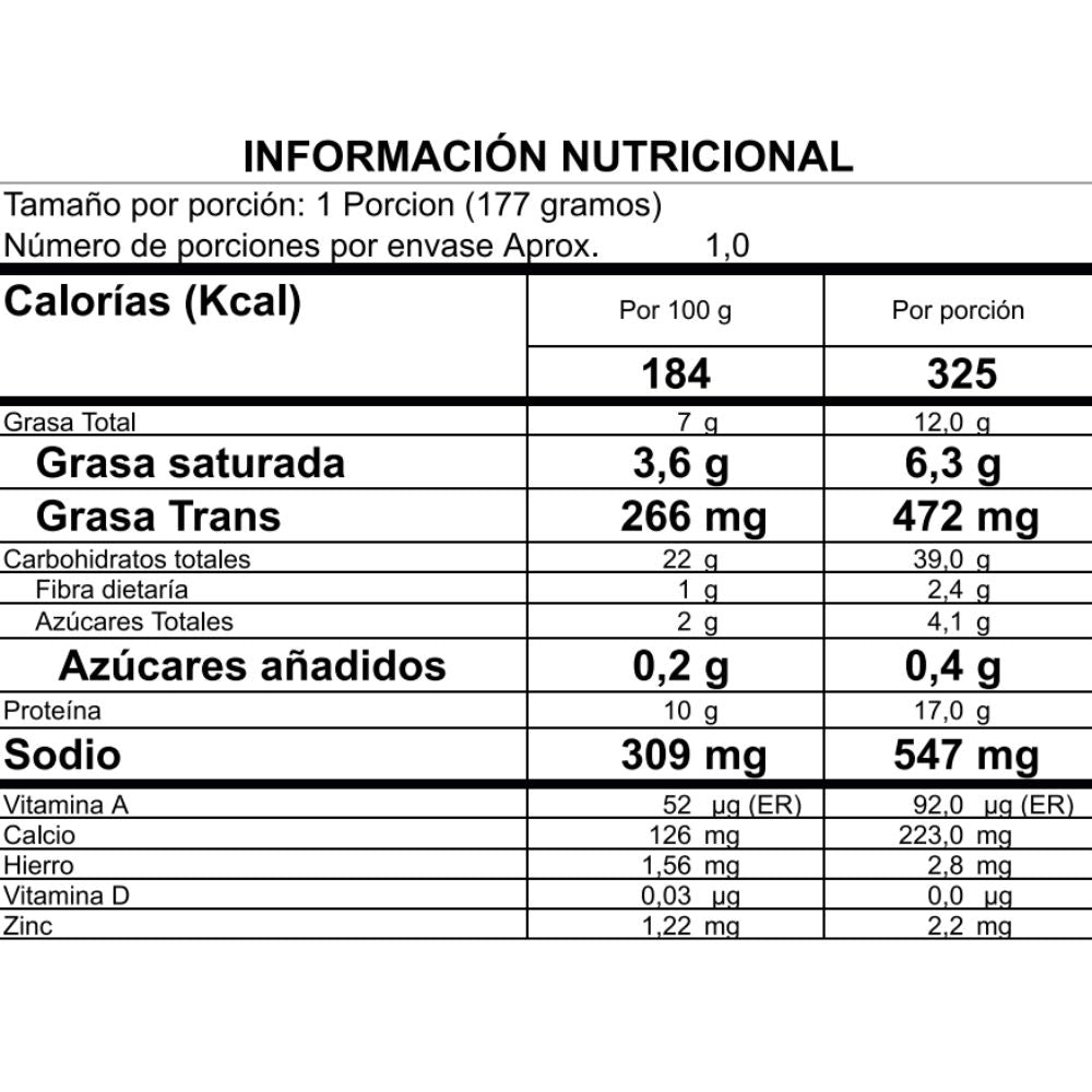 Ingredientes: Masa madre de centeno (Harina de trigo fortificada, harina de centeno, levadura fresca sal, aceite de oliva), queso doble crema, salsa napolitana (tomate, cebolla, zanahoria, fécula de maíz, panela, sal, albahaca, aceite de oliva y pimienta), piña natural, jamón de pavo. Contiene leche y gluten. Puede contener trazas de soya, apio y pistachos.